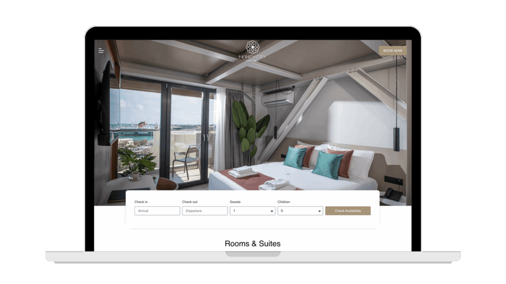 Το Infinity City Boutique Hotel βρίσκεται στην καρδιά του Ηρακλείου, λίγα βήματα από το ιστορικό λιμάνι και το Αρχαιολογικό Μουσείο — με 29 σύγχρονα δωμάτια, δωρεάν πρωινό και βαθμολογία 8.6 στο Booking.com. Παρά τις εξαιρετικές κριτικές και την κεντρική του θέση, η παλιά ιστοσελίδα δεν αντικατόπτριζε την ποιότητα του ξενοδοχείου και δεν υποστήριζε άμεσες κρατήσεις αποτελεσματικά.