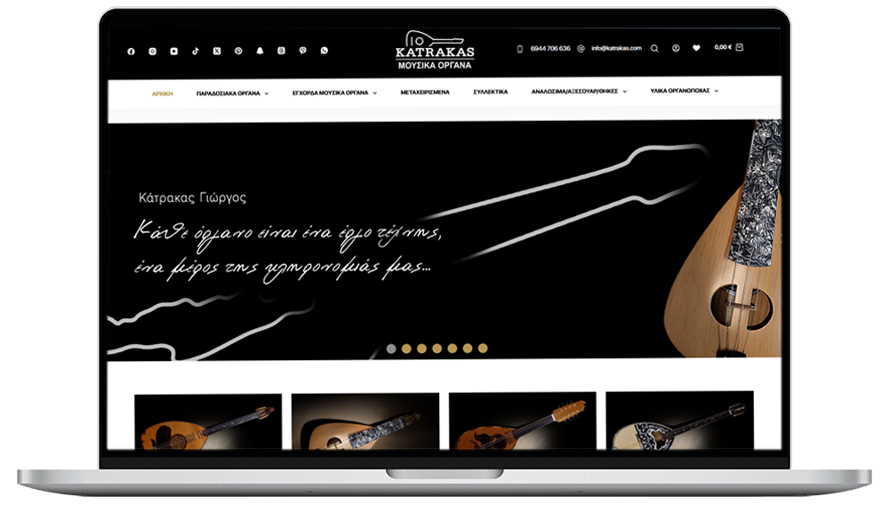 Katrakas needed a modern and user-friendly e-commerce website that effectively showcases the beauty and craftsmanship of traditional Greek musical instruments while enabling secure and seamless online shopping. The main challenge was to create a visually captivating platform that not only highlights the uniqueness of each handmade instrument but also conveys the rich cultural heritage behind the craft. Additionally, the website required multilingual support to reach international customers and optimized SEO strategies to attract musicians and collectors from around the world.