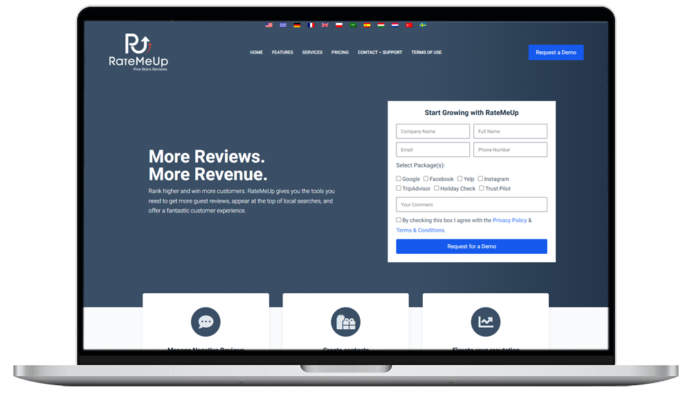 RateMeUp.online needed a modern and intuitive platform that could efficiently handle the collection and management of online reviews while maintaining a user-friendly interface for businesses of all sizes. The primary challenge was to create a seamless user experience that simplifies the review collection process while providing powerful tools to monitor, manage, and respond to customer feedback effectively. Additionally, the platform needed to be secure, scalable, and optimized for search engines to attract a broader audience of businesses looking to improve their online reputation.